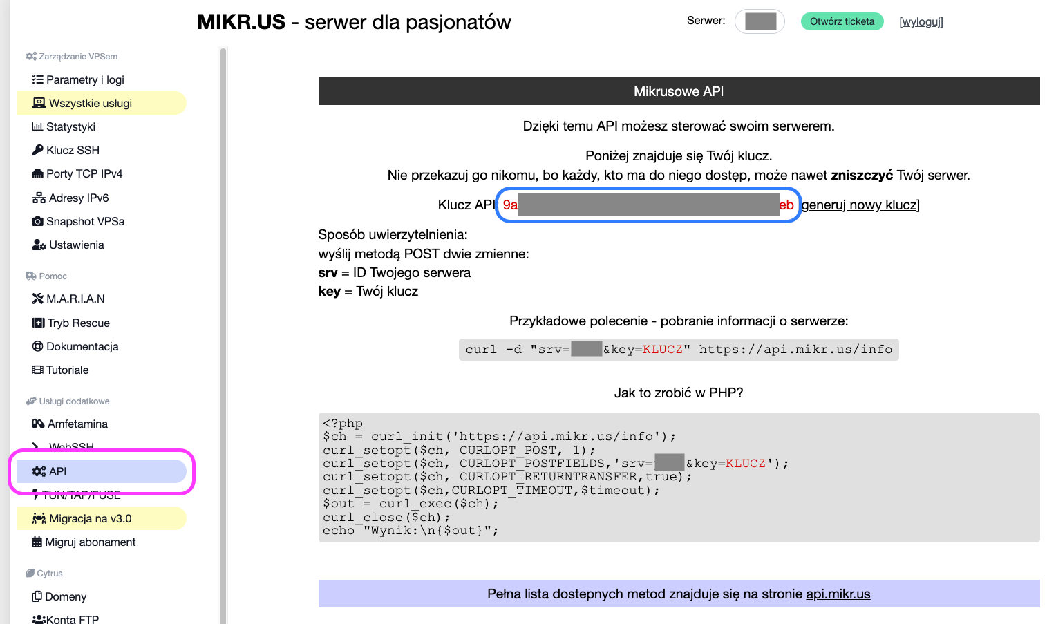 API, lub otwierając nową pustą zakładkę/okno przeglądarki i nawigując do strony: https://mikr.us/panel/?a=api.